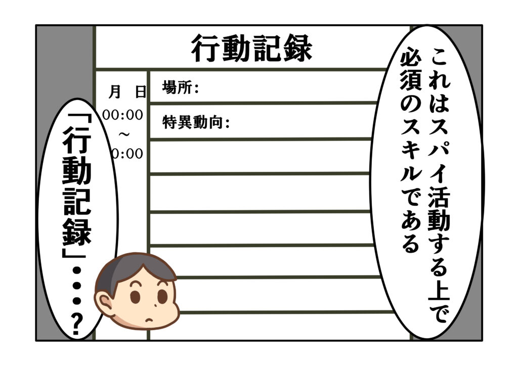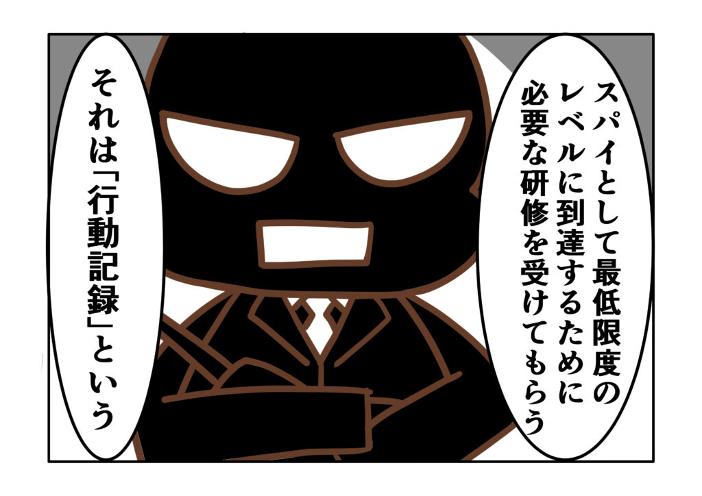 そんな新人スパイくんの前に現れたのは、研修を指導する教官スパイたち。研修早々、スパイになるために不可欠とされる課題が新人スパイくんを含む研修員全員に課される。それは「行動記録」という耳慣れないものであった・・・