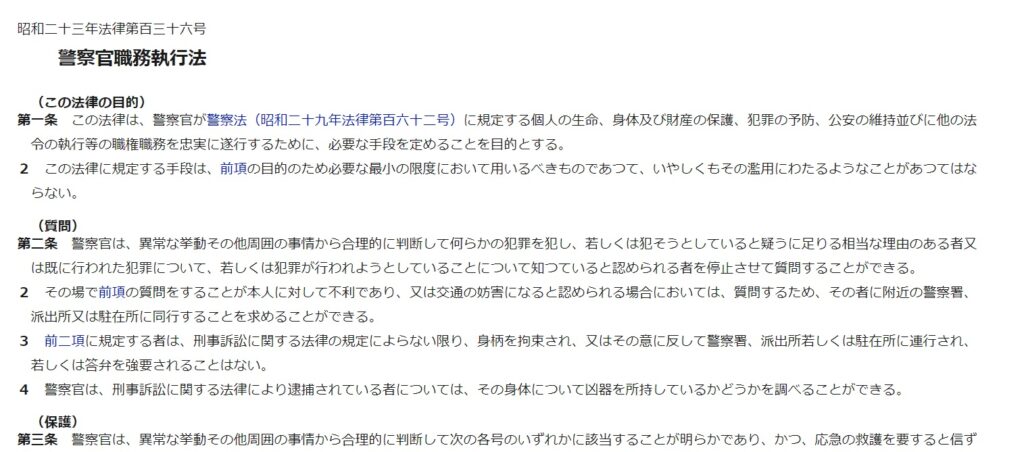 これが警察などの法執行機関の場合、例えば、警察官職務執行法、刑事訴訟法など手続き法が定められ、職務質問の場合は「警察官は、異常な挙動その他周囲の事情から合理的に判断して何らかの犯罪を犯し、若しくは犯そうとしていると疑うに足りる相当な理由のある者又は既に行われた犯罪について、若しくは犯罪が行われようとしていることについて知っていると認められる者を停止させて質問することができる」(警察官職務執行法第2条)と、強制権限の執行手続きが具体的に定められています。同時に、「前二項に規定する者は、刑事訴訟に関する法律の規定によらない限り、身柄を拘束され、又はその意に反して警察署、派出所若しくは駐在所に連行され、若しくは答弁を強要されることはない」(同2条3項)と、強制権限に対する規制も定められています。