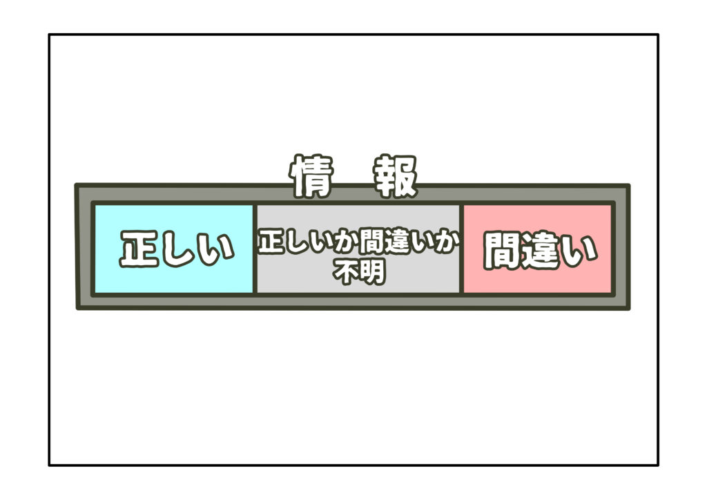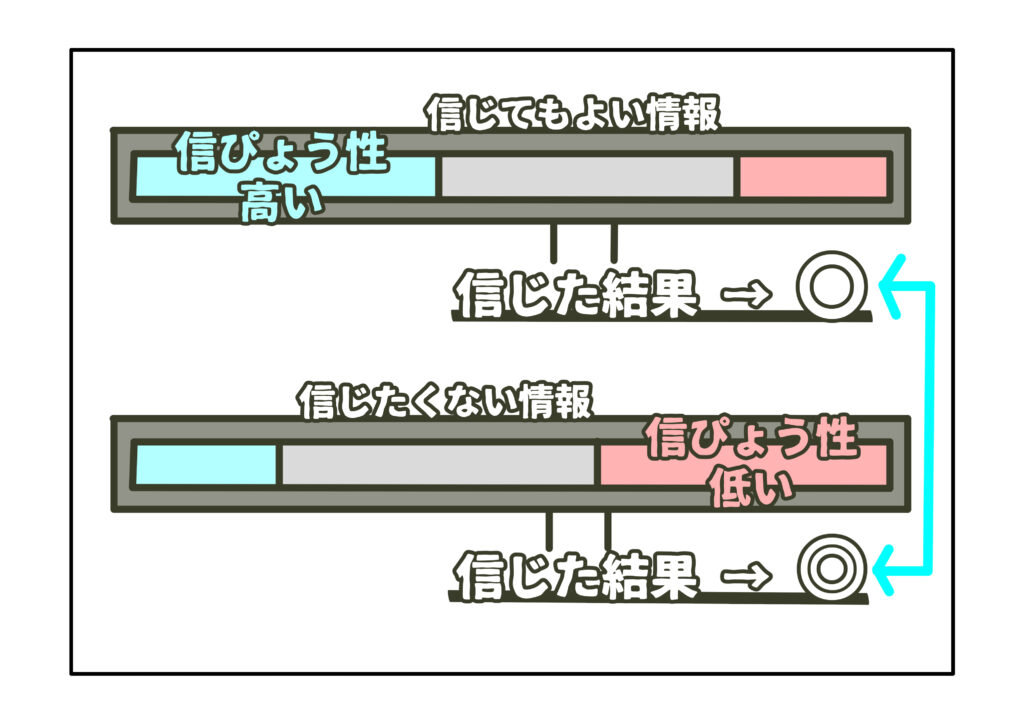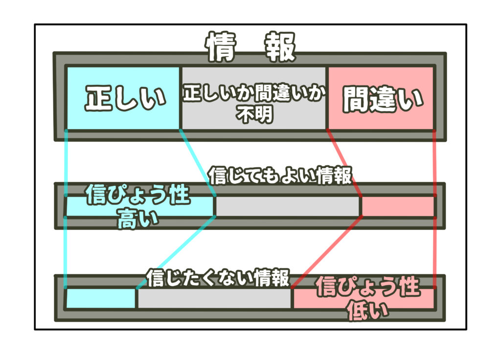 情報の信ぴょう性とは、ある情報を信じることで生じ得る被害を想定し、その想定を鑑みて、どこまで信じてよいかということを判断する概念です。100%正しい情報など存在しておらず、いかなる情報も正しいと言えるのは最大で99%までであり、逆にいかなる虚偽情報も1%の正しさを伴っています。常に、情報は、正しさと間違いが不可分の混合物であり、正しさのみを切り離すことはできません。故に、情報の正しい部分がもたらす結果と、情報の間違いの部分がもたらす結果を比較する必要があります。正しい部分がもたらす結果が間違いの部分がもたらす結果を上回ると判断される場合、双方の量的概念に応じて信じることが可能な度合いを決めます。