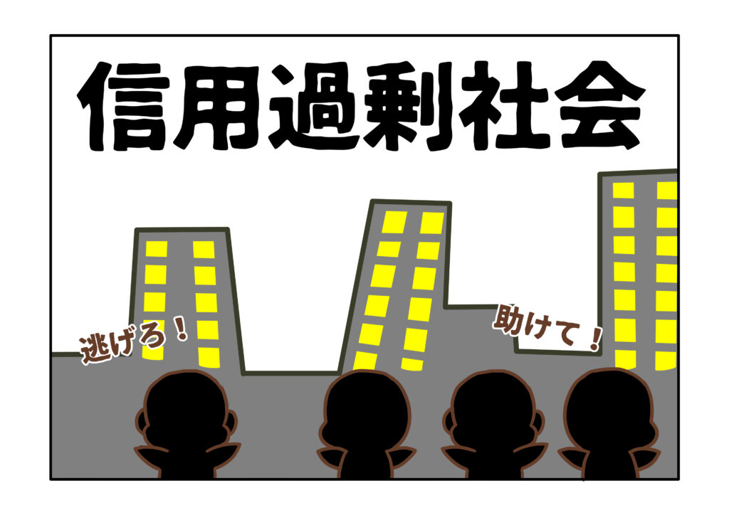 「信用過剰社会」では、信用をひたすら集めて、信用を失わないようにすることに意識が過剰に集中しがちであり、信用の内実について議論が深まる様子はありません。人々は、信用の無謬性を無意識に信じてしまい、信用自体が次第に一人歩きを始めて、人間に取り扱うことができないような困難かつ巨大な概念へと様変わりしていきます。もはや、「信用過剰社会」の信用とは、人間を支配する一種の「怪物」とすら表現できます。この怪物こそ、信用を失うことで結果的に起こり得る不安と恐怖を社会全体に振り撒き、人々を更なる不信へと駆り立てているのです。