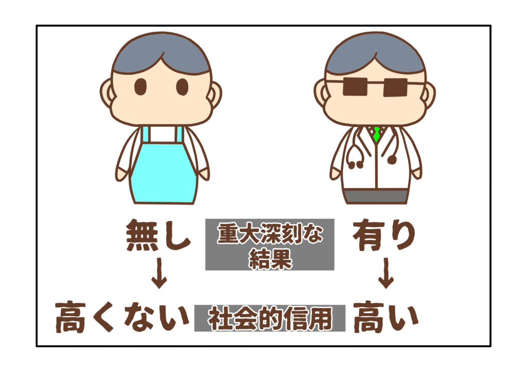 例えば、医師の間違いとバイト店員の間違いとは信用という点において同列に論じられる性質でしょうか。医師とは、歴史的に社会的信用の高い職業の一つです。医師は、人間の生命と健康という重大かつ深刻な価値を取り扱うプロであるからです。逆に言えば、医師が何かを間違えることがあれば、それは、人間の生命と健康に支障を及ぼしかねないため、間違いが認められるなどと安易に受容すべきでありません。医師は、結果次第で信用が大きく左右されることから、信用こそ常に念頭に置かねばならないわけです。ただ、これは、医師という人間の生命と健康に重大かつ深刻な結果を及ぼしかねないという信用事情にある場合の話です。