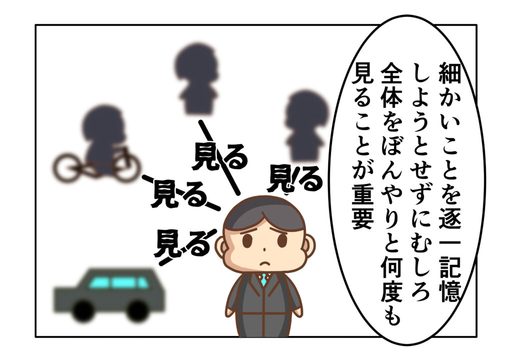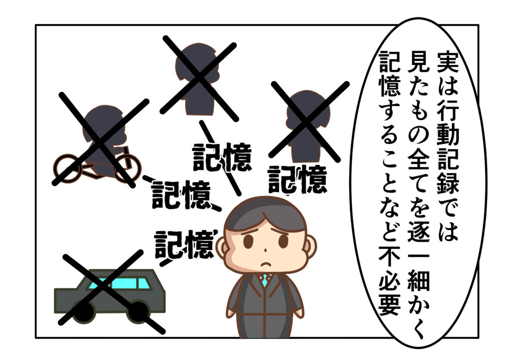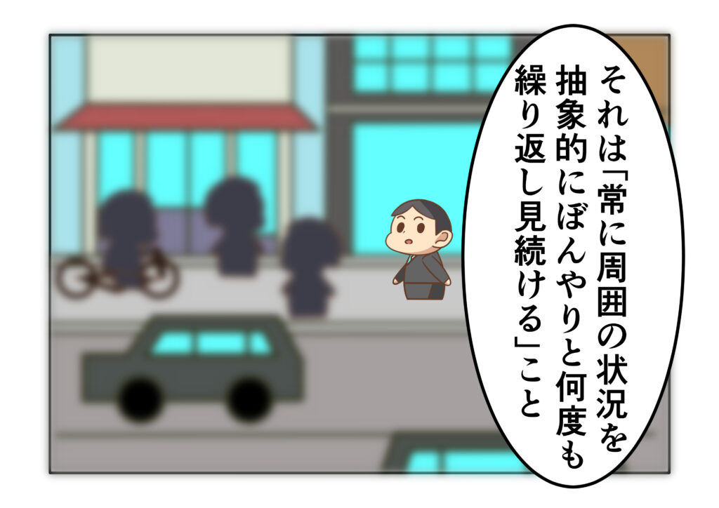 そんな新人スパイくんに対し、元スパイ・クマさんは、行動記録の訓練に対するアドバイスを伝える。それは、「常に周囲の状況を抽象的にぼんやりと何度も繰り返し見続ける」というものであった・・・