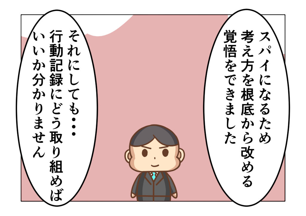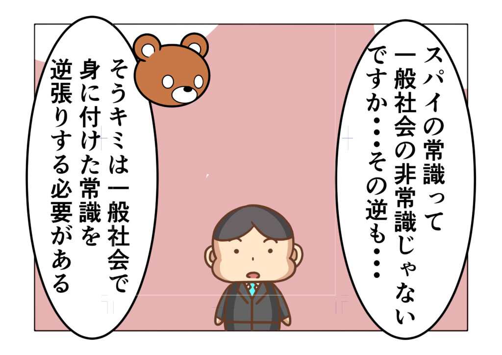 元スパイ・クマさんの説明によって、新人スパイくんは、ようやくスパイの常識と非常識を知るに至り、自身が憧れて飛び込んだ世界の現実に触れる。同時に、行動記録という訓練に改めて取り組む意欲を取り戻す。