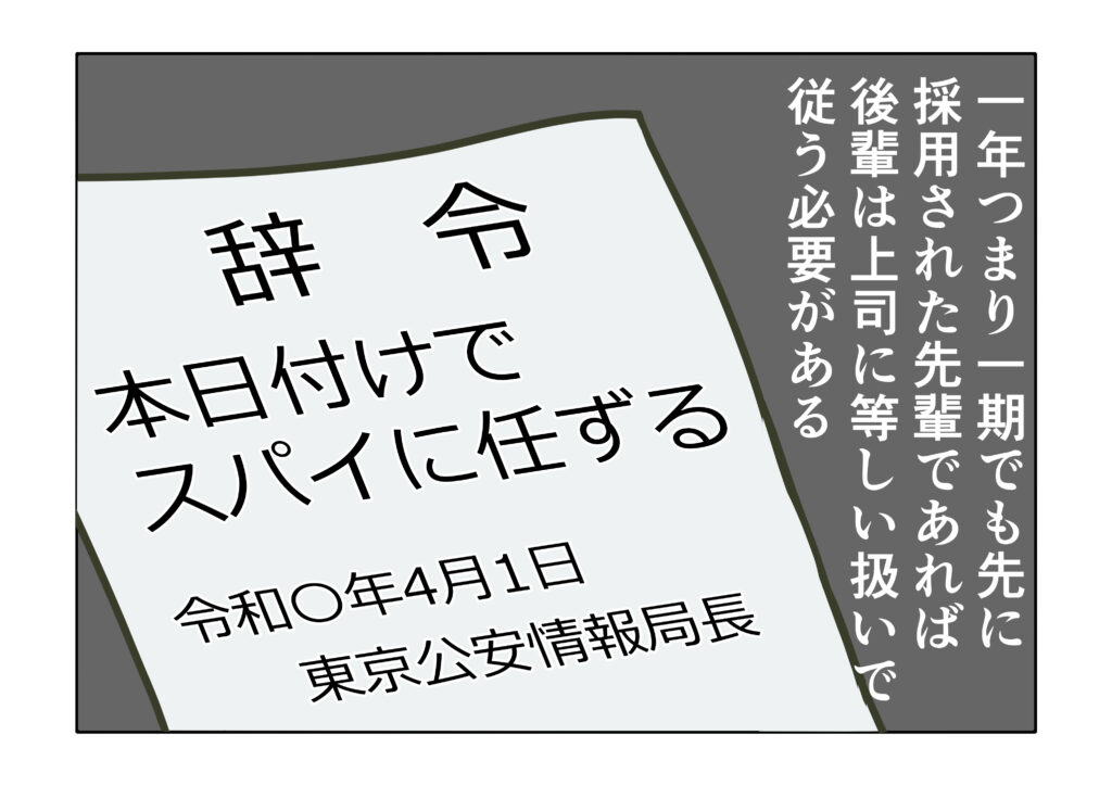 スパイ創作マンガ・新人スパイ配属編第011話:元スパイが語るスパイの常識と非常識③ スパイ創作マンガ 2025.01.27 スパイの世界は、想像以上に人間臭く、泥臭い仕事で満たされており、一部には、体育会系に近い上下関係が存在する。互いの関係においては、採用年次が重視され、一年つまり一期でも先に入庁した先輩であれば、後輩は上司に等しいレベルで従う必要がある。俗に「一期上は神」などと言われる。 これは、スパイが人間から情報を入手するため、どこまでも人間を取り扱う仕事であるためだ。組織内部から人間関係の構築に必要な苦労を経験させるのである。 新人スパイ配属編第012話:元スパイが語るスパイの常識と非常識④ へ続く