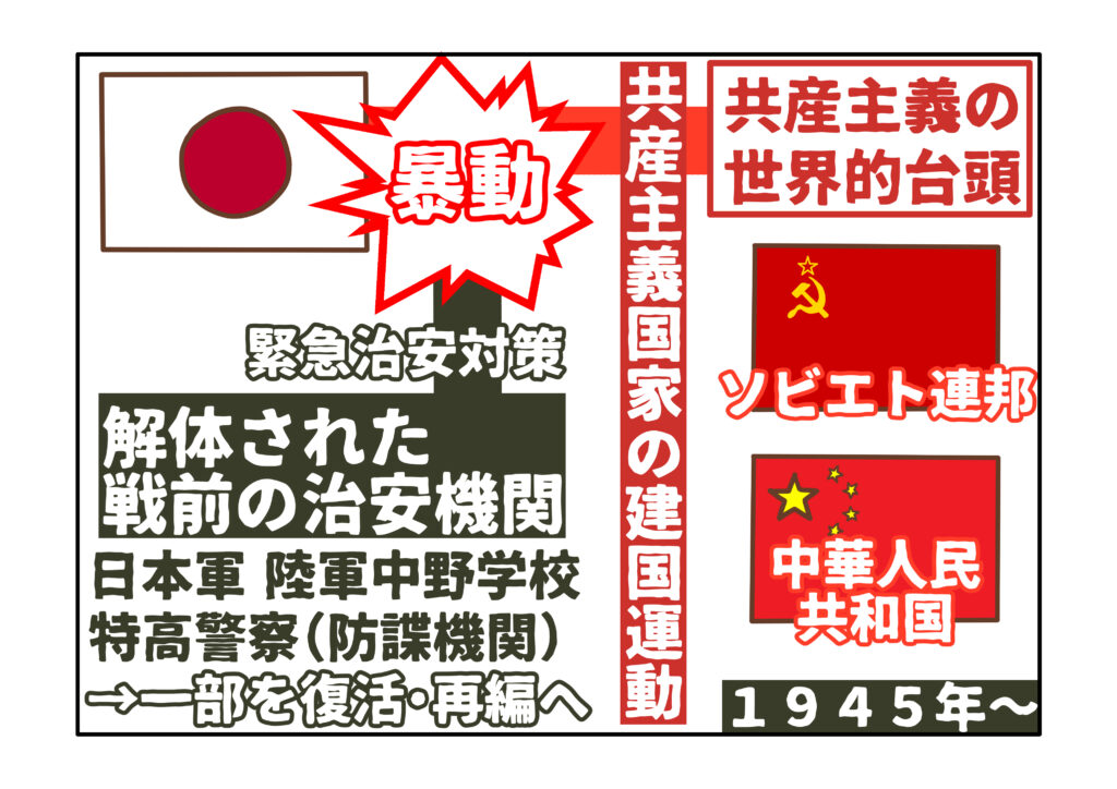敗戦直後の日本では、国家体制を崩壊させかねない暴動が発生するようになりました。背景には、ソ連や中国など共産主義国家が台頭し、世界各国で共産主義化国家を建国しようとする運動が高まったためです。