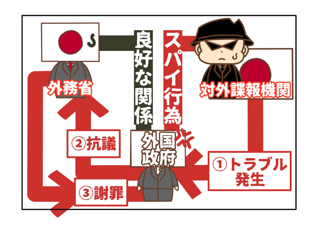 外務省は、外国における日本政府の活動を一元的に管理するため、同じく外国で活動する対外諜報機関の設置には消極的です。外務省の仕事は原則、外国政府と良好な関係を構築することですが、対外諜報機関は、スパイ行為という好ましいと言えない活動を外国政府に仕掛けるためです。スパイ行為が外国政府と何らかのトラブルになれば、外務省が外国政府から抗議され、謝罪しなければなりません。