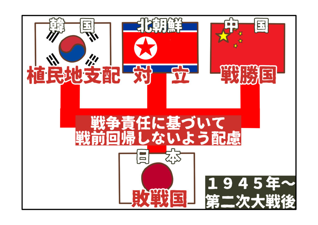 日本は、第二次世界大戦で敗戦して以来、戦後は一貫して、国際社会への協調が求められる立場です。特に、周辺国には、日本が植民地とした韓国、日本と対立する北朝鮮、そして第二次世界大戦の戦勝国である中国があり、常に配慮が必要です。
