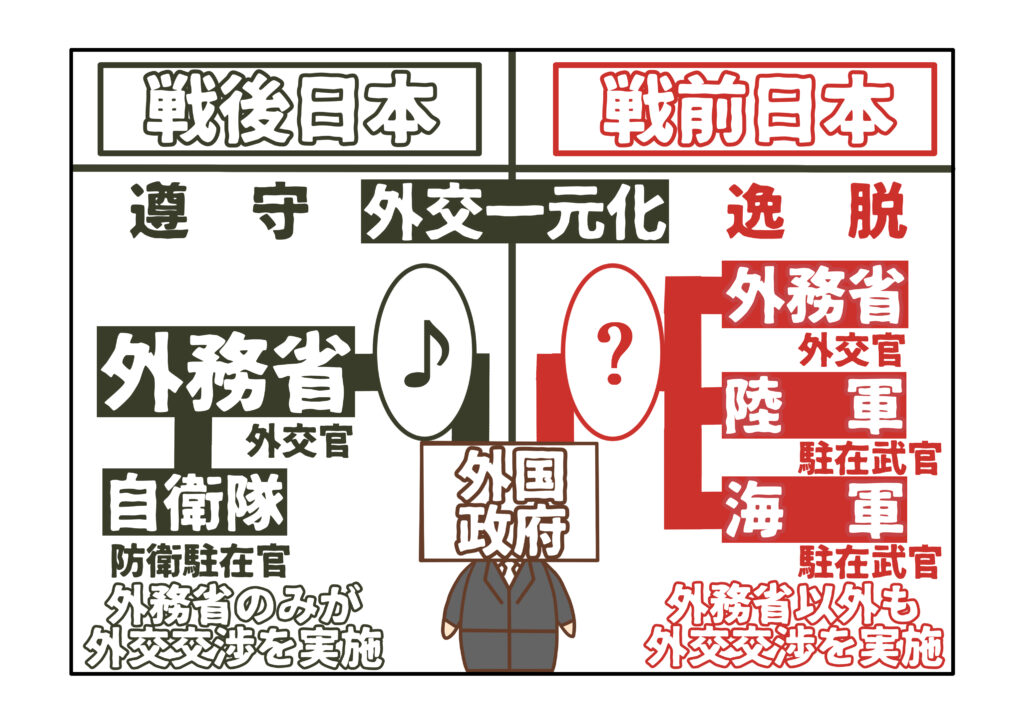 戦前の日本は、「外交一元化の原則」を逸脱していました。「外交一元化の原則」とは、外国との連絡や交渉などあらゆる外交を外務省のみが行い、他の省庁は、外務省を経由せずに外国と付き合ってはならないというルールです。