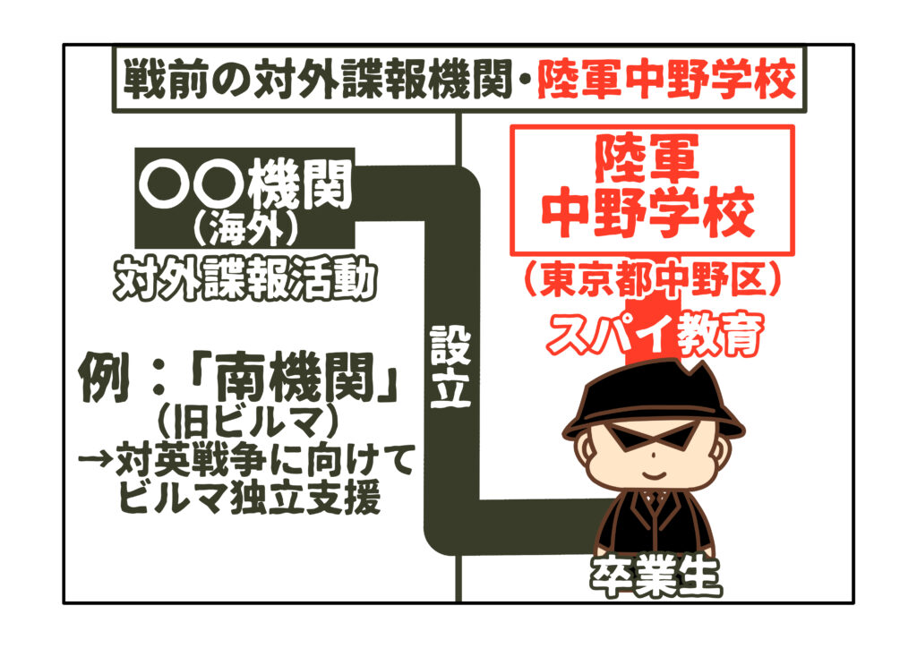 日本では、第二次世界大戦前に、陸軍の一部署として「陸軍中野学校」が東京都中野区に設置されました。あくまでもスパイの教育機関ですが、卒業生が集められて、「〇〇機関」と呼ばれる個別の対外諜報機関が、状況に応じて設立又は解体される形式でした。