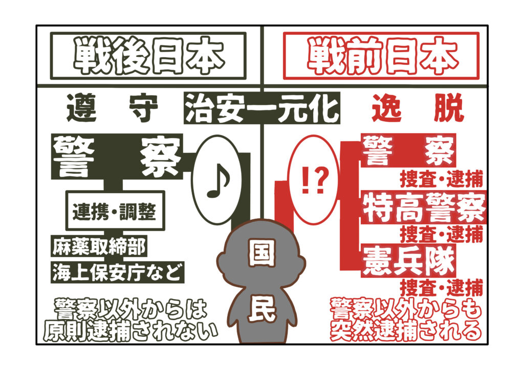 戦前であっても警察が治安維持を担っていましたが、他にも逮捕権を有する治安機関が存在していました。例えば、日本軍に所属する憲兵隊があります。憲兵隊は本来、軍内部のルールを破った軍人を捜査して逮捕することが任務です。しかし、軍国主義下では、政府を批判する民間人にまで捜査や逮捕をしていました。