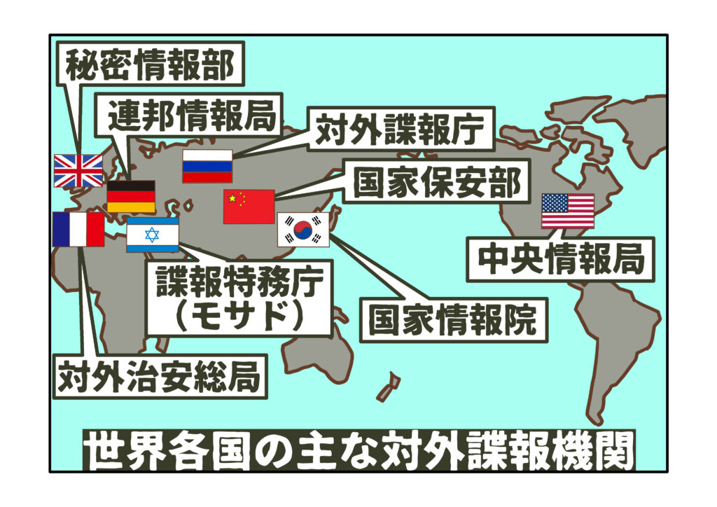 そのほか、イスラエルのモサド(諜報特務庁)フランスの対外治安総局(DGSE)ドイツの連邦情報局(BND)ロシアの対外諜報庁(SVR)中国の国家保安部(MSS)、韓国の国家情報院(NIS)などがあります。