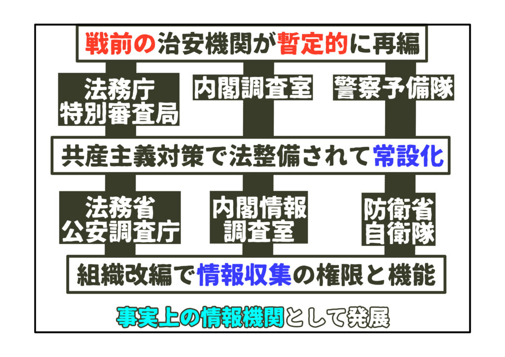 こうして警察予備隊内閣調査室、そして法務庁特別審査局などが再編されました。当時は、緊急事態に対応する暫定的な治安機関という扱いに過ぎません。しかし、東西冷戦の開始とともに、共産主義運動への対応が継続的に必要となり、法整備されて常設の治安機関となります。