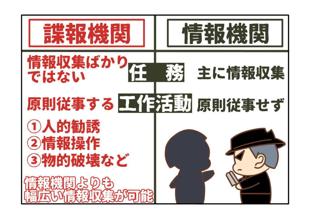 「情報機関」とは、情報の収集を主な任務とする一方、「諜報機関」は、情報収集に加えて、人的勧誘、情報操作、物的破壊なども任務とします。