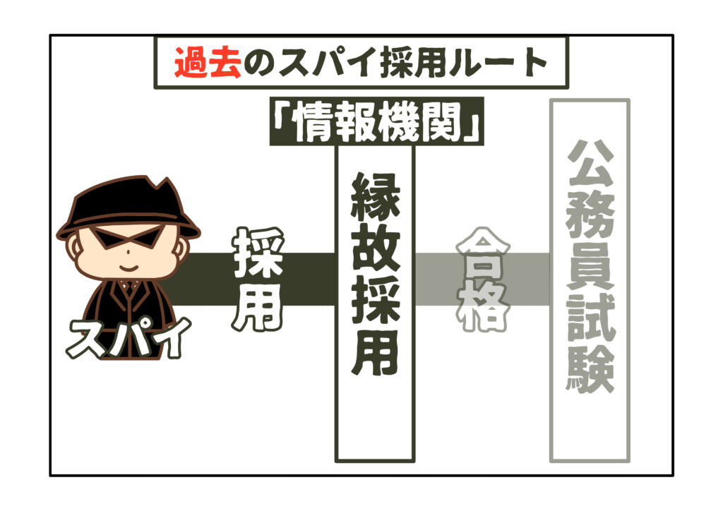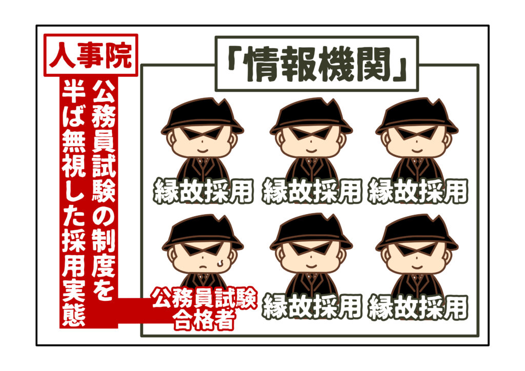 「情報機関」には、スパイの大半が、公務員試験を受験していない縁故採用者であり、公務員試験の合格者からの採用が少数にとどまるという時代がありました。公務員採用を一括管理する政府機関として人事院がありますが、人事院からは、公務員試験の制度を半ば無視した採用実態として苦情が出たほどです。
