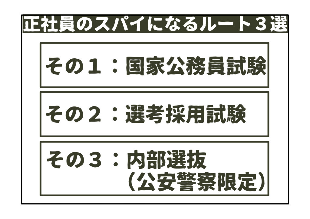 正社員こそ、一般的なスパイのイメージに相応しいと考えられるため、やはり公務員試験の受験が必須となります。