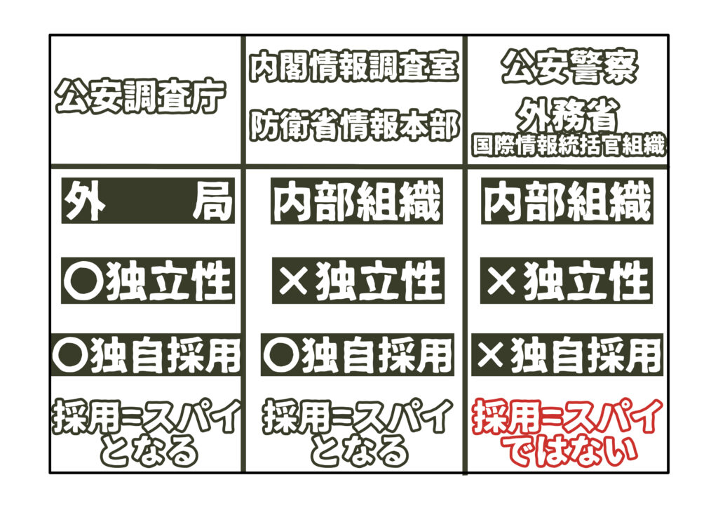 公安調査庁は、法務省の内部組織ではなく、外局という位置付けであり、法務省から一定程度の独立性があります。その上で、スパイの独自採用を行なっているため、「採用イコールスパイ」となります。