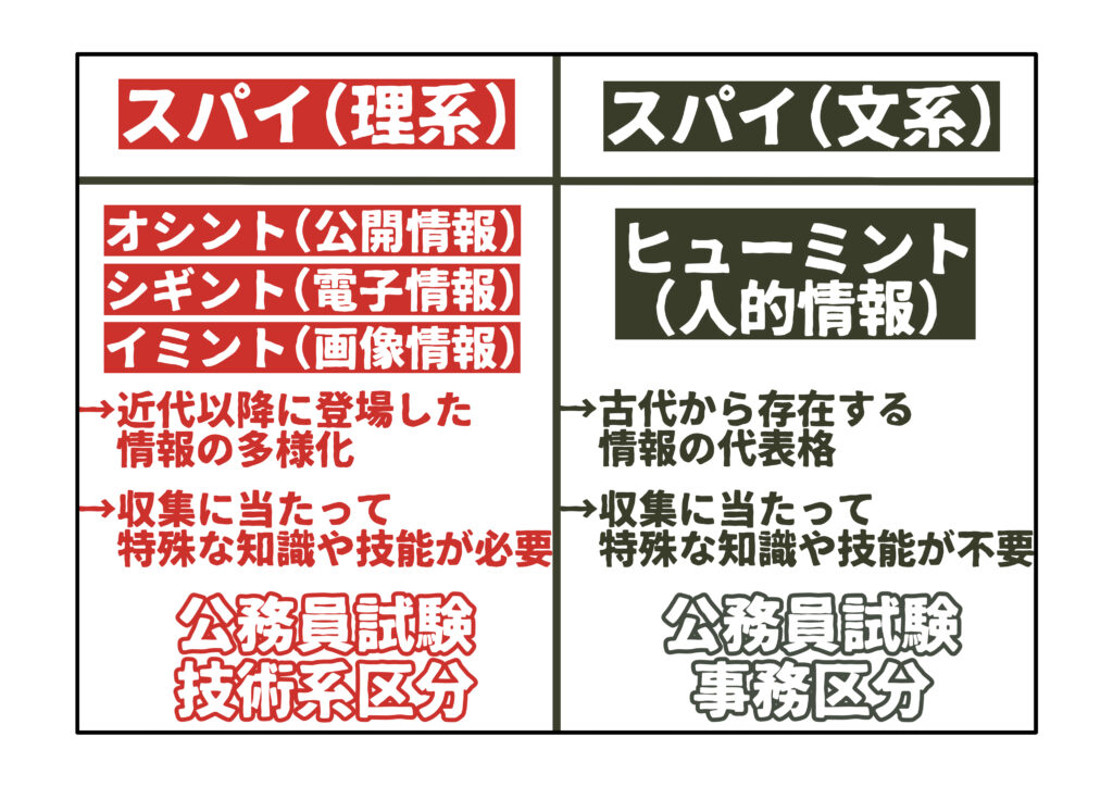 スパイにも、取り扱う情報の種類次第で文系と理系に分かれた採用ルートがあります。スパイが取り扱う情報は、代表的な分類として、ヒューミント(人的情報)、オシント(公開情報)、シギント(電子情報)、イミント(画像情報)が挙げられます。