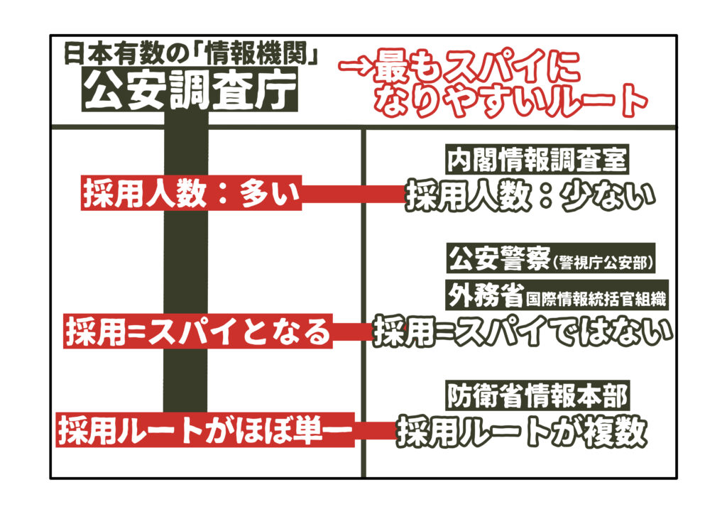 したがって、公安調査庁は、採用人数が多く、「採用イコールスパイ」であり、採用ルートがほぼ一本化されているという点で、「情報機関」の中で最もスパイになりやすいと言えます。