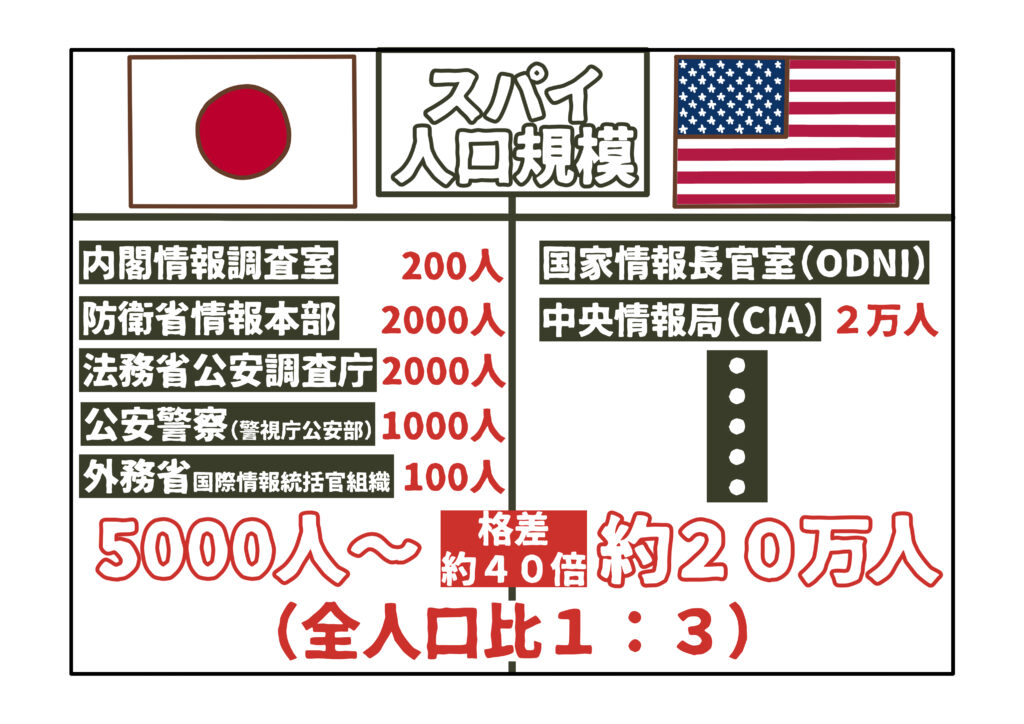 米国の場合、国家情報長官室(ODNI)や中央情報局(CIA)など情報コミュニティーを構成する情報機関の人員規模は、合わせて約20万人とされます。これは、日本の約40倍に相当します。日本と米国の全人口比をおよそ1対3と考えると、日本のスパイ人口がいかに少ないかが分かります。