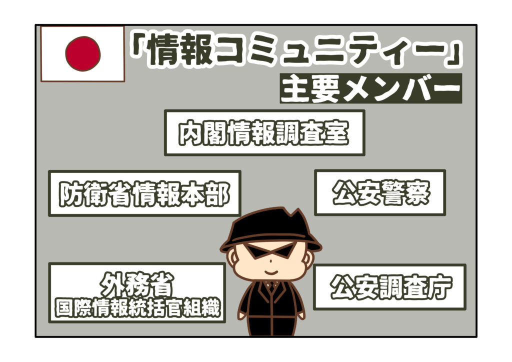 それでは、具体的にどのような「情報機関」があるのでしょうか。日本政府には、「情報コミュニティー」と呼ばれる「情報機関」の集まりが存在します。この情報コミュニティーを構成する主要メンバーとしては、①内閣情報調査室、②警察庁、③公安調査庁、④外務省そして⑤防衛省の5つが指定されています。