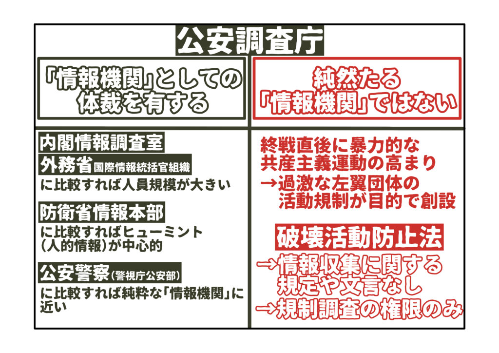 公安調査庁はそもそも、「情報機関」として発足したわけではありません。終戦直後に暴力的な共産主義運動が高まり、過激な左翼団体の活動を規制することを主な目的として、創設されました。公安調査庁が所管する破壊活動防止法には、情報収集に関する規定や文言は存在しておらず、あくまでも「規制に関して必要な調査ができる」などとあるだけです。こうした法的枠組は現在も変わっておらず、純然たる「情報機関」とは言い難い実態にあります。