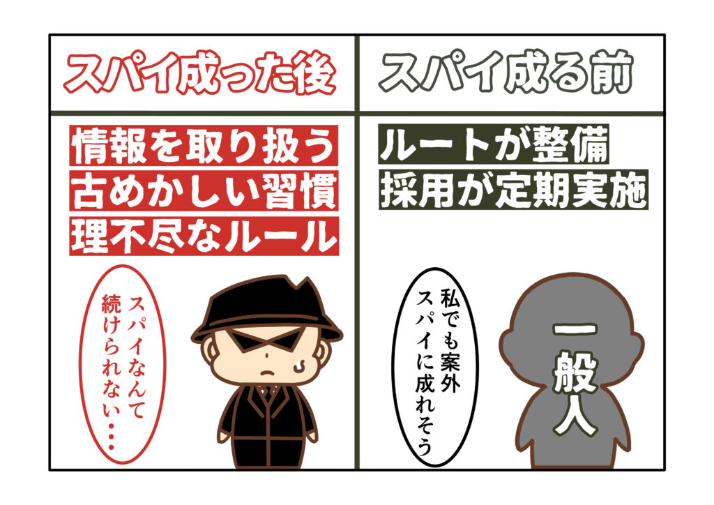 歴史的な経緯もあって、他の職種に比べると、スパイの採用ルートは、まだまだ限定的と言わざるを得ません。