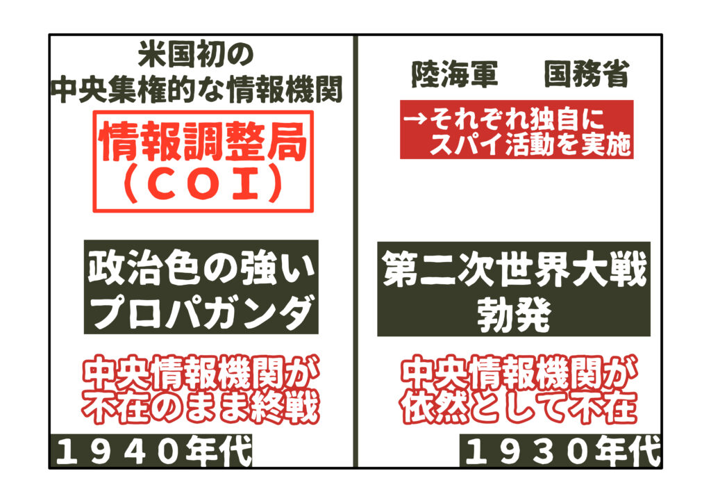 1939年に第二次世界大戦が始まっても、対外情報を収集する中央情報機関が設立されず、日本とは対照的でした。1941年に日本との開戦直前になって、当時のルーズベルト大統領の発案で、陸海軍や国務省の「スパイ活動」を調整する「情報調整局」(COI)が設立されました。中央集権的な情報機関としては初めてでしたが、これも主に、戦時中のプロパガンダ宣伝に用いられた一面があります。国家横断的な中央情報機関が不在のまま、終戦を迎えたのです。