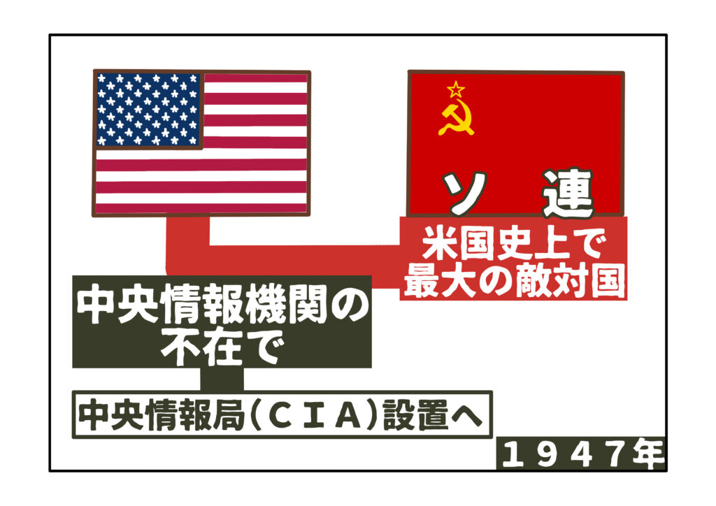 米国は、第二次世界大戦の戦勝国となりましたが、大戦直後にソ連との関係が急速に悪化する中で、第一次世界大戦から数十年続いた中央情報機関の不在を見直すことになります。米国は歴史的に、情報収集と諜報工作無くして戦争に勝利してきましたが、ソ連は、米国史上で最大の敵対国であり、中央情報機関の必要性が高まったのです。