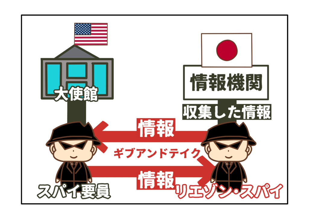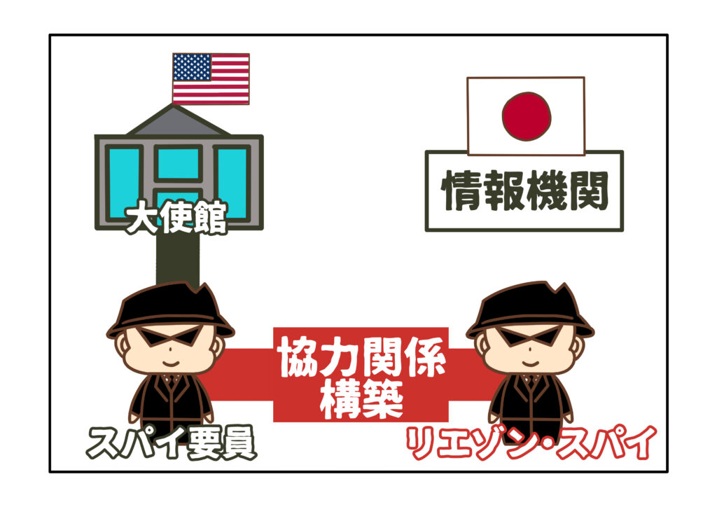 各国大使館には、非公式ながら外国の情報機関から派遣されたスパイ要員が外交官身分で勤務しています。これが「リエゾン・スパイ」の「スパイ活動」上のターゲットとなります。ターゲットに接触し、情報機関レベルで協力関係を構築するよう依頼します。一般的なスパイは、個人レベルで協力関係を構築しますが、「リエゾン・スパイ」は、組織レベルという点で特殊なスパイです。