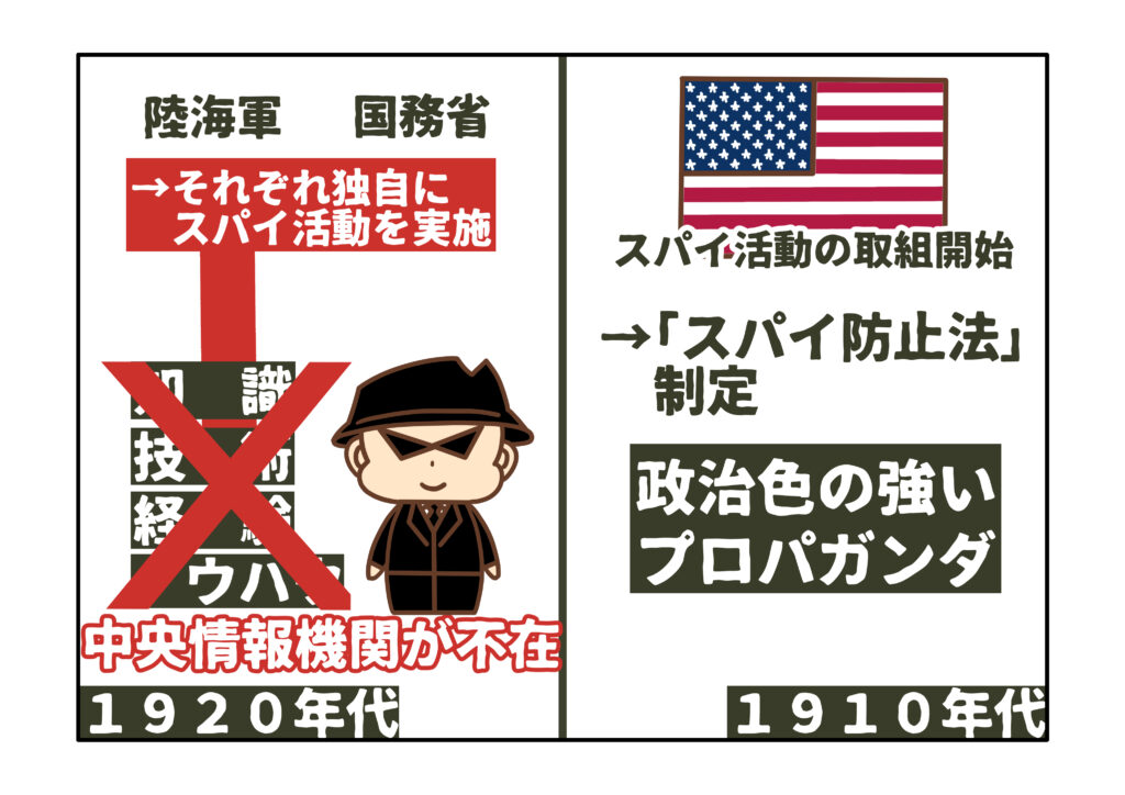 陸海軍や国務省がそれぞれ独自に情報収集と諜報工作を展開していましたが、これらを調整する中央情報機関や調整組織が存在しておらず、「スパイ活動」のスキルとノウハウを組織的に蓄積できていません。世界各国へスパイを送り込むよりも、米国内の情報が他国から奪われないよう内向きな「スパイ活動」に終始しました。