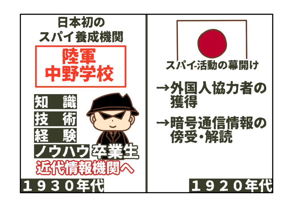 第二次世界大戦の目前である1938年には、「防諜研究所」という形で「スパイ活動」が組織化され、これが日本初のスパイ養成機関となる「陸軍中野学校」へつながります。第一次世界大戦後から数十年の時を経て、日本の「スパイ活動」は、国家横断的な近代情報機関としての体裁を整えたわけです。