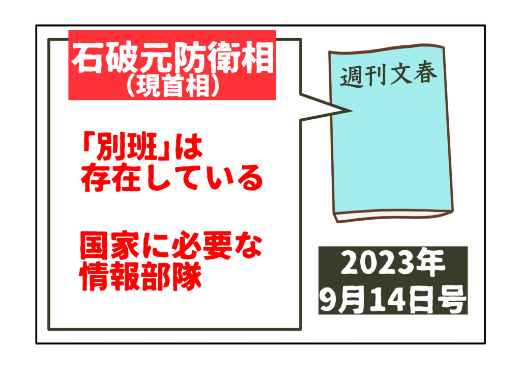 石破茂首相は、2024年の現職就任に先立つ段階で、注目すべき発言を残しています。週刊文春(2023年9月14日号)の取材に対し、当時の石破氏は「別班は存在している」「国家にとって必要な情報部隊」などと述べ、これまで長く噂にとどまっていた「別班」の実在を事実上認めるような発言をしました。