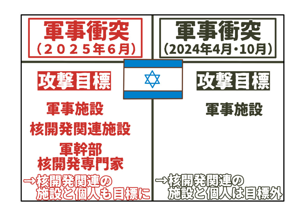 イスラエルは、これまでに2024年4月と10月の2度、イランに対して軍事攻撃を実施していますが、その際はいずれも核施設や石油関連施設といった国家中枢への直接的な攻撃は避けてきました。しかし、今回は方針を転換し、核関連施設を新たな主要ターゲットとして明確に設定した点が、過去の衝突とは一線を画しています。