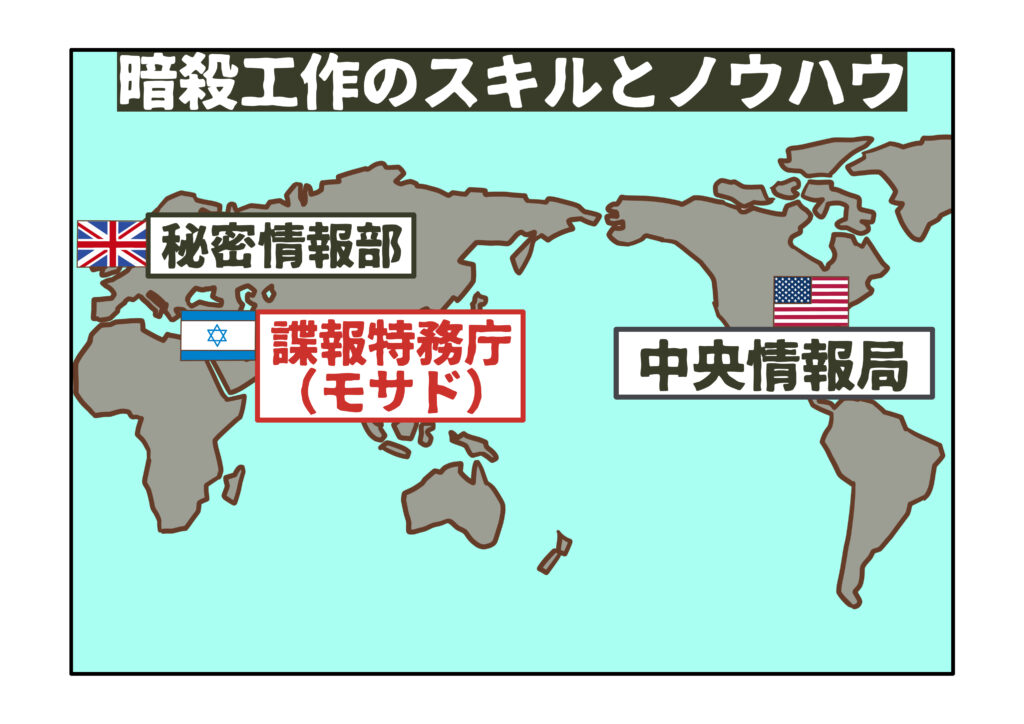 中でもモサドは、国外での個人標的型攻撃において、最も多くの実戦経験を積んできた組織とされています。暗殺工作のスキルとノウハウにおいては、長い活動実績を背景に、MI6やCIAをも上回るとみられています。
