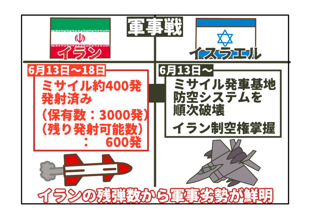 このまま戦闘が長引けば、イラン側は軍事的にも“消耗戦”に追い込まれ、戦局を挽回する手段は極めて限られる状況です。