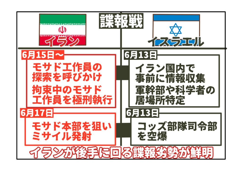イランは、軍事行動に先立つ諜報戦においてすでに劣勢であるため、戦場においてもイスラエルに対して優位に立つのは極めて困難な状況にあります。