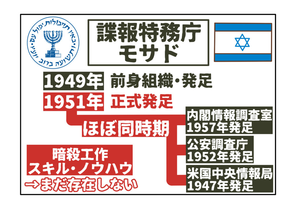 イスラエルは、1948年に建国された比較的新しい国家であり、その歴史はまだ80年にも満たないものです。モサドもその前身組織が1949年に立ち上げられ、正式な発足は1951年と、ごく最近のことに思えるかもしれません。