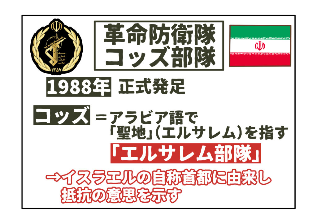 「コッズ」とはアラビア語で聖地エルサレムを意味する「クドゥス」に由来し、「エルサレム部隊」とも訳されます。エルサレムは、イスラエルが首都と位置づけている都市であり、部隊名そのものが反イスラエル的な象徴性を帯びています。