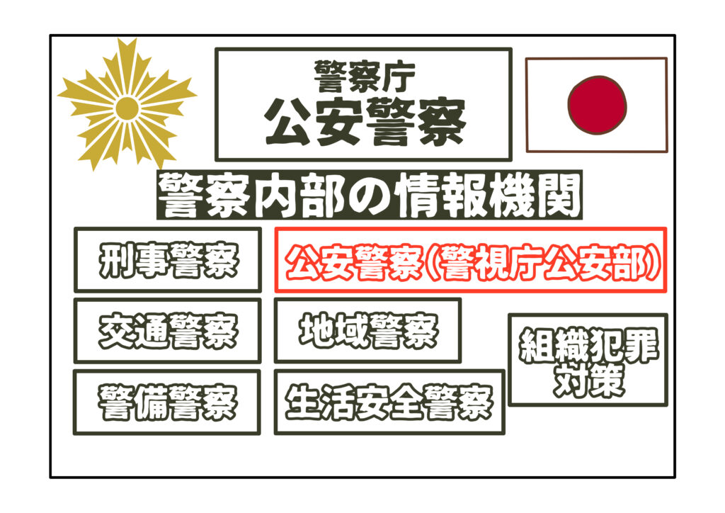その下の階層には、生活安全警察、刑事警察、地域警察などの部署が入居しており、公安警察が「国内治安に特化した情報機関」として、警察組織の中に組み込まれていることが明確にわかります。