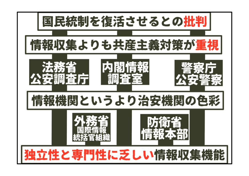 つまり現在の日本では、公安警察も公安調査庁も、あくまで警察や法務省の一部として情報収集機能を“付属的に”持つにとどまっているのです。