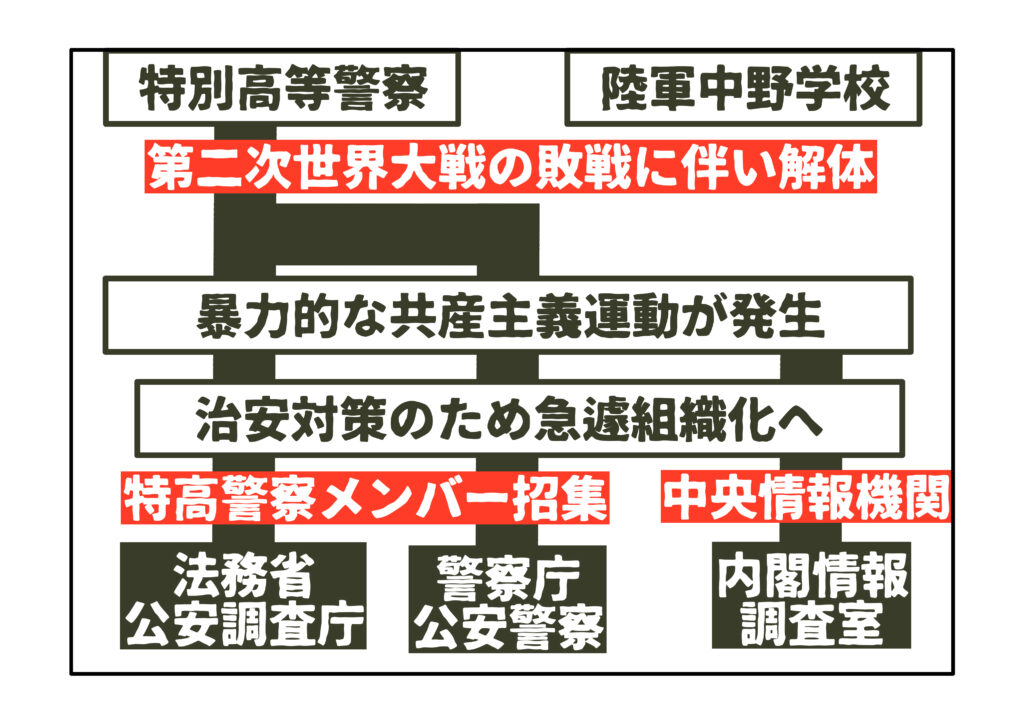 ・特高警察の流れを受け継ぐ形で、公安警察(警察庁の内部組織)と、公安調査庁(法務省の外局)が設置され、