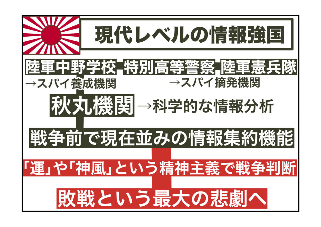 つまり、日本は開戦前の時点で、現代の水準に比べても遜色ないほど高度で信頼できる情報を持っていたのです。それにもかかわらず、最終的な判断は「運」や「神風」といった精神主義に委ねられ、科学的分析は顧みられませんでした。ここにこそ、情報強国でありながら戦争に敗れた日本の最大の悲劇があったのです。