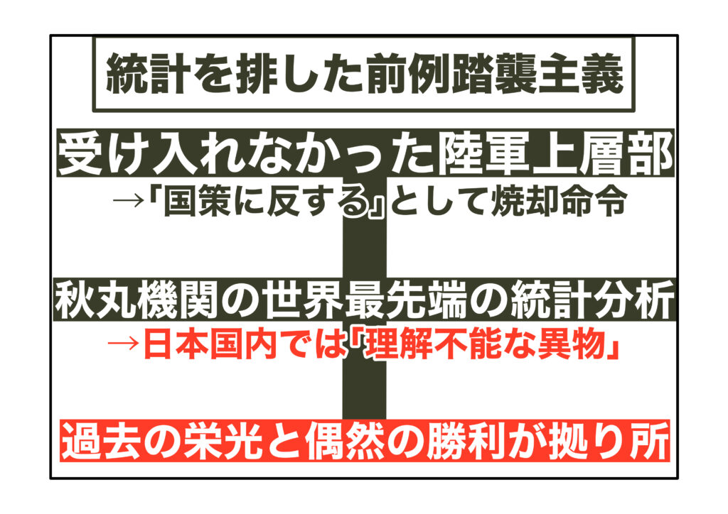 この言葉が示すのは、科学的分析よりも「過去の経験」、「現場感覚」そして「運」を信じる体質でした。秋丸機関の先進的な統計分析は、世界基準では最前線の手法だったにもかかわらず、日本では“理解不能な異物”とみなされてしまったのです。そして判断の拠り所にされたのは、過去の栄光と偶然の勝利だけでした。